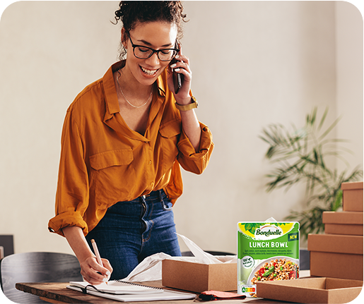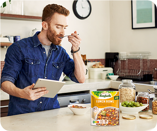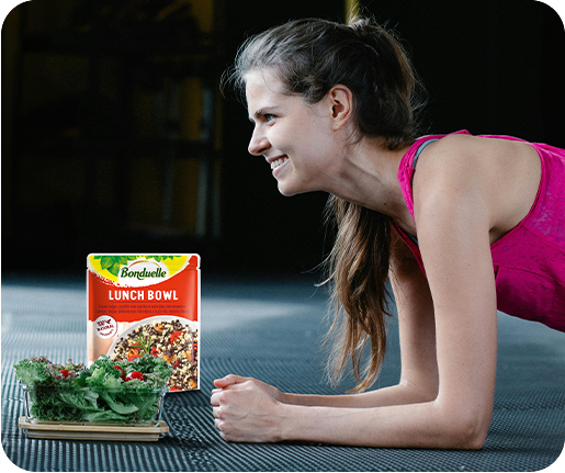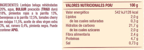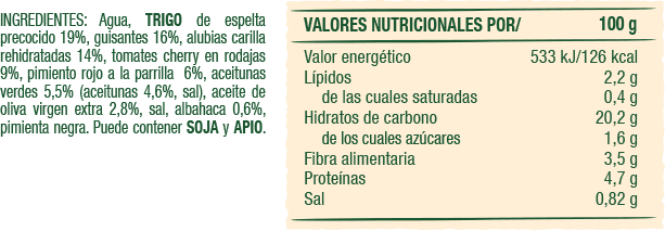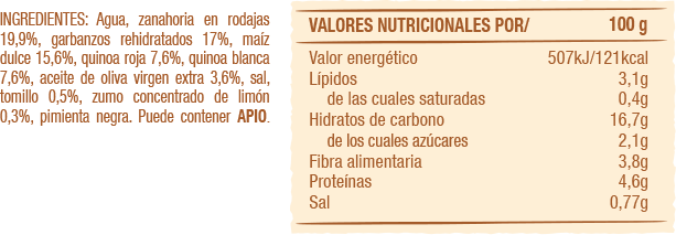 Sabrosísima mezcla de crujientes granos de maíz, trozos de zanahoria, quinoa blanca y roja y garbanzos con un sútil toque de tomillo, limón y aceite de oliva virgen extra.